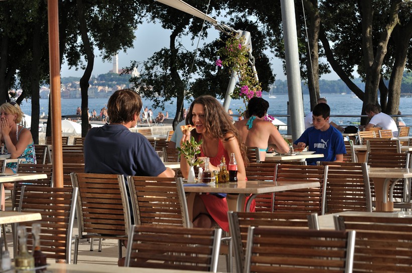 Zum kulinarischen Angebot auf dem Campingplatz gehören mehrere Bars und Restaurants, z. B. die Pizzeria Kandela, in der italienisch inspirierte Gerichte am offenen Kamin zubereitet werden.